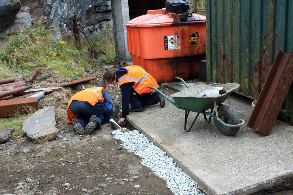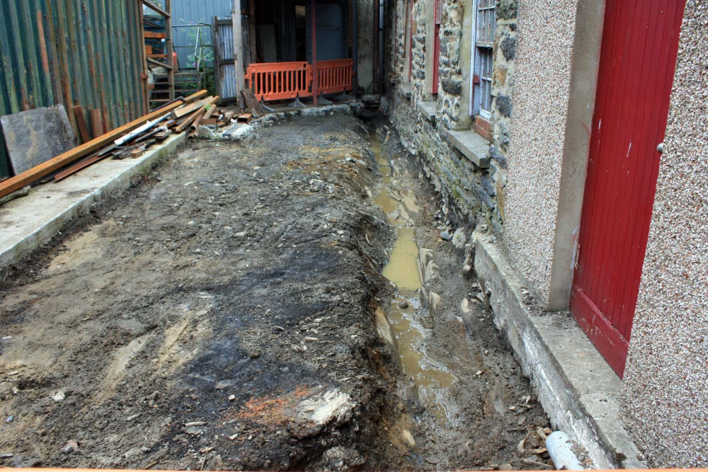 Our drains job at the back of the Machine Shop was to put in a drain to stop water getting through the wall and flooding the shop floor. A contractor came in with a mini digger and dug the trench along the wall down to bed rock.