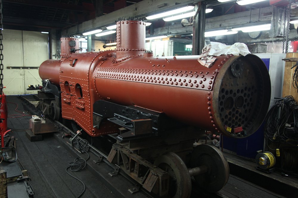 Merddin was dismantled, with the bogies run out and stored in the Erecting Shop and the tanks and cab stored outside. The smokeboxes and chimneys were removed also.