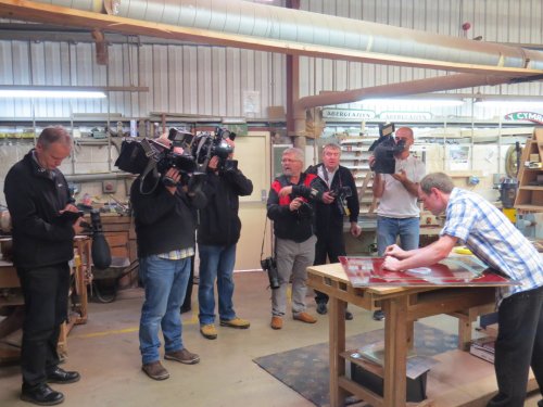 In the carriage shed he tried his hand at trying his hand at lining out, on an example piece, under the guidance of Glenn Williams.